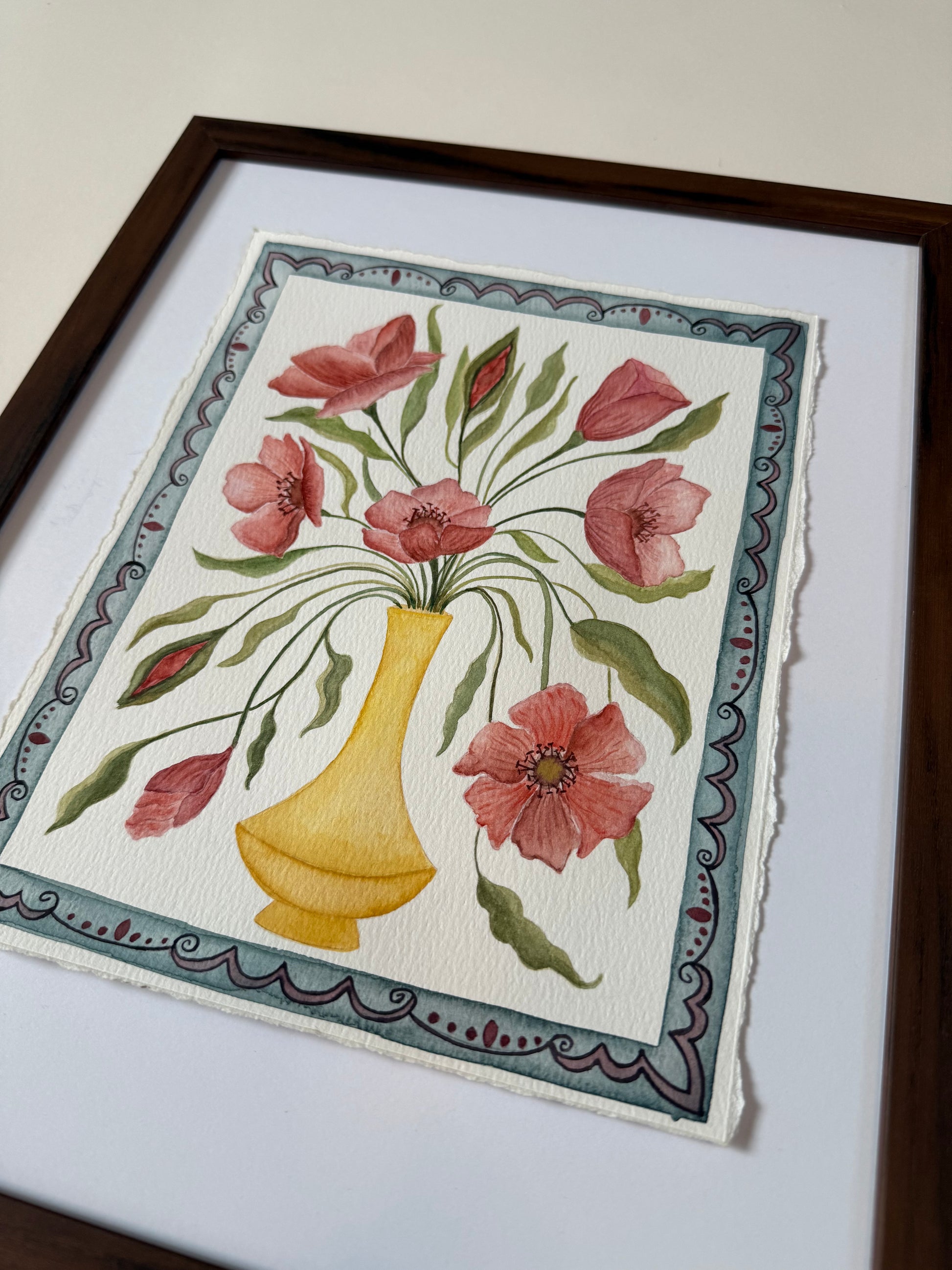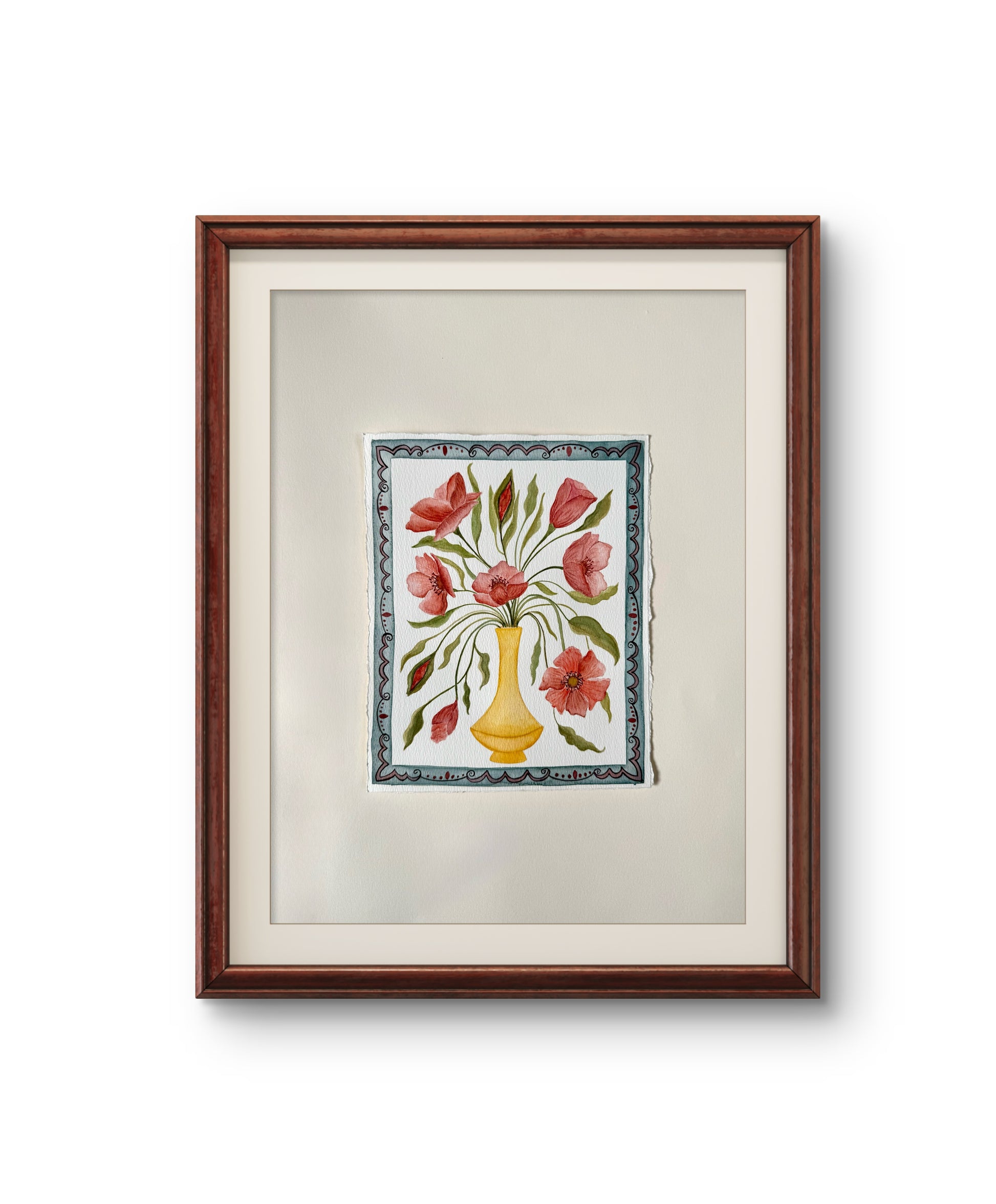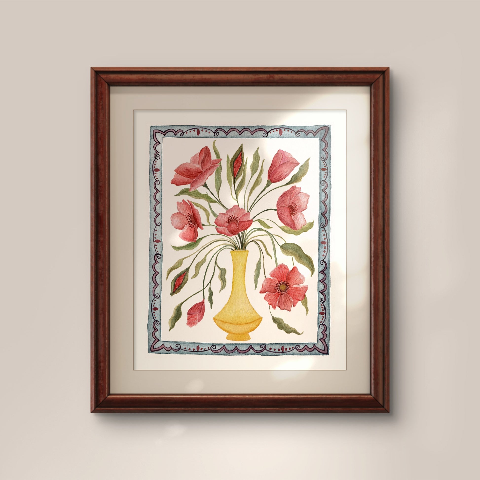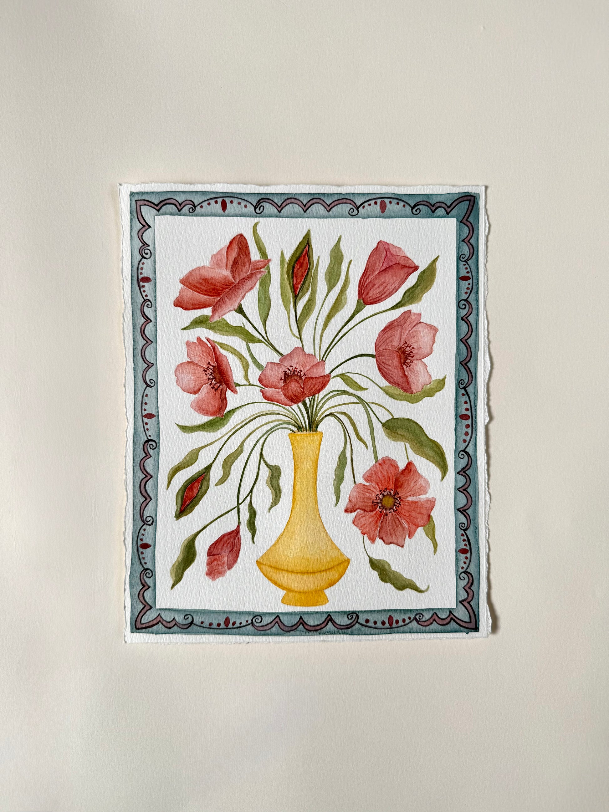 These Are For Me is a study of a midcentury modern metal vase filled with red poppies and framed by a border inspired by vintage lace. This piece is intuition, daring, and self-discovery.