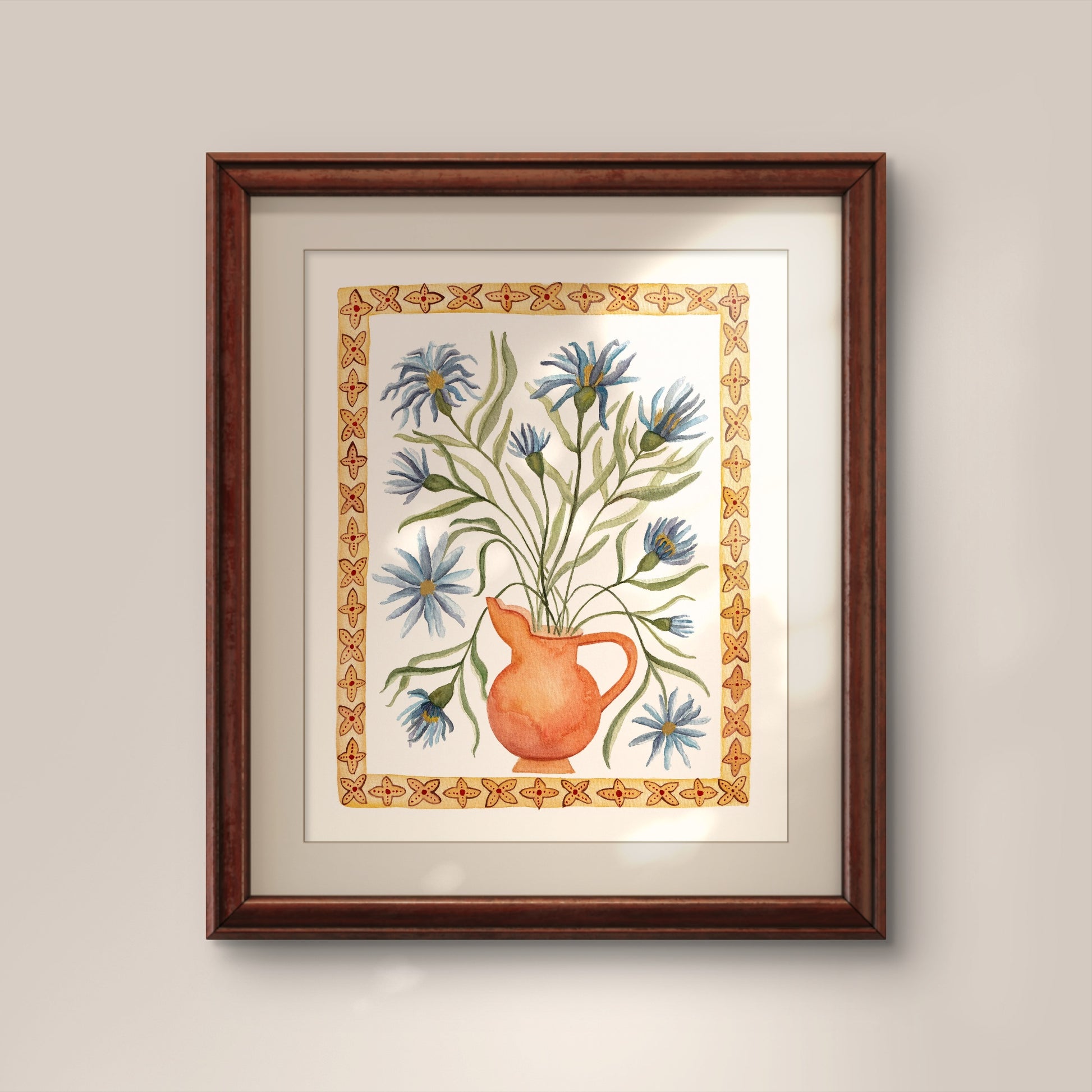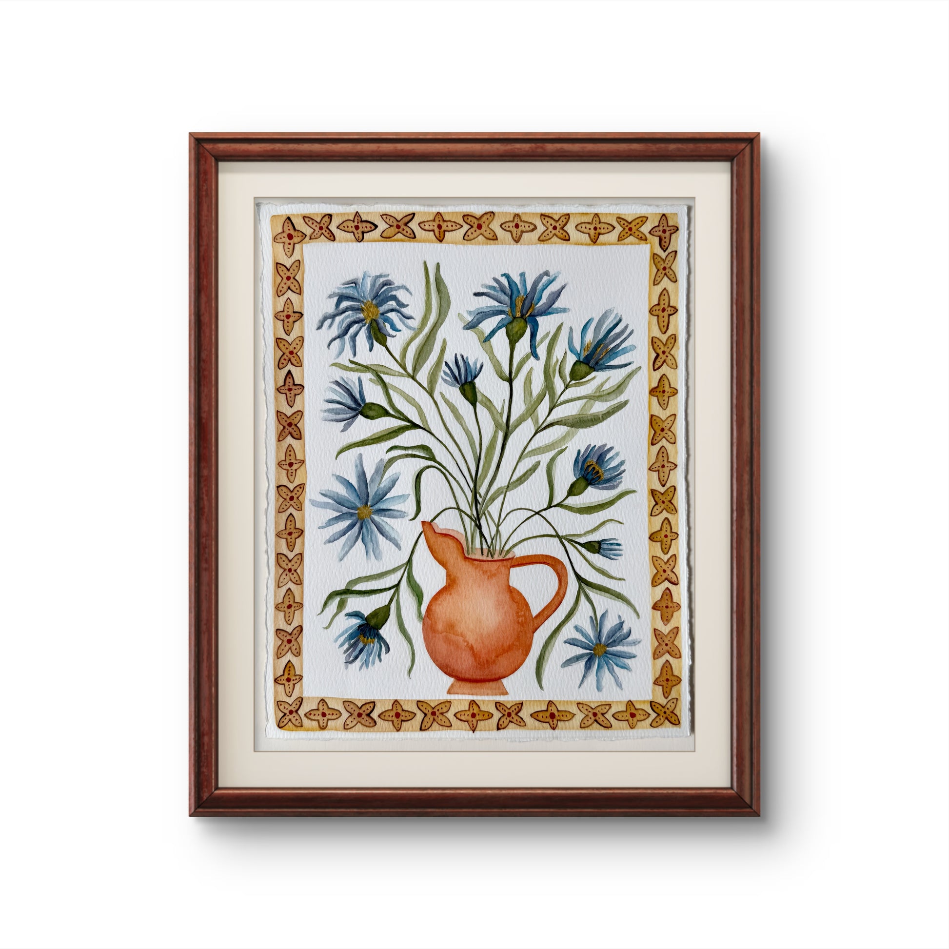 A study of an Islamic-inspired vessel form filled with aster flowers and framed by a geometric border. These Are For Us is excited romance, allegiance, and the feeling of forever.