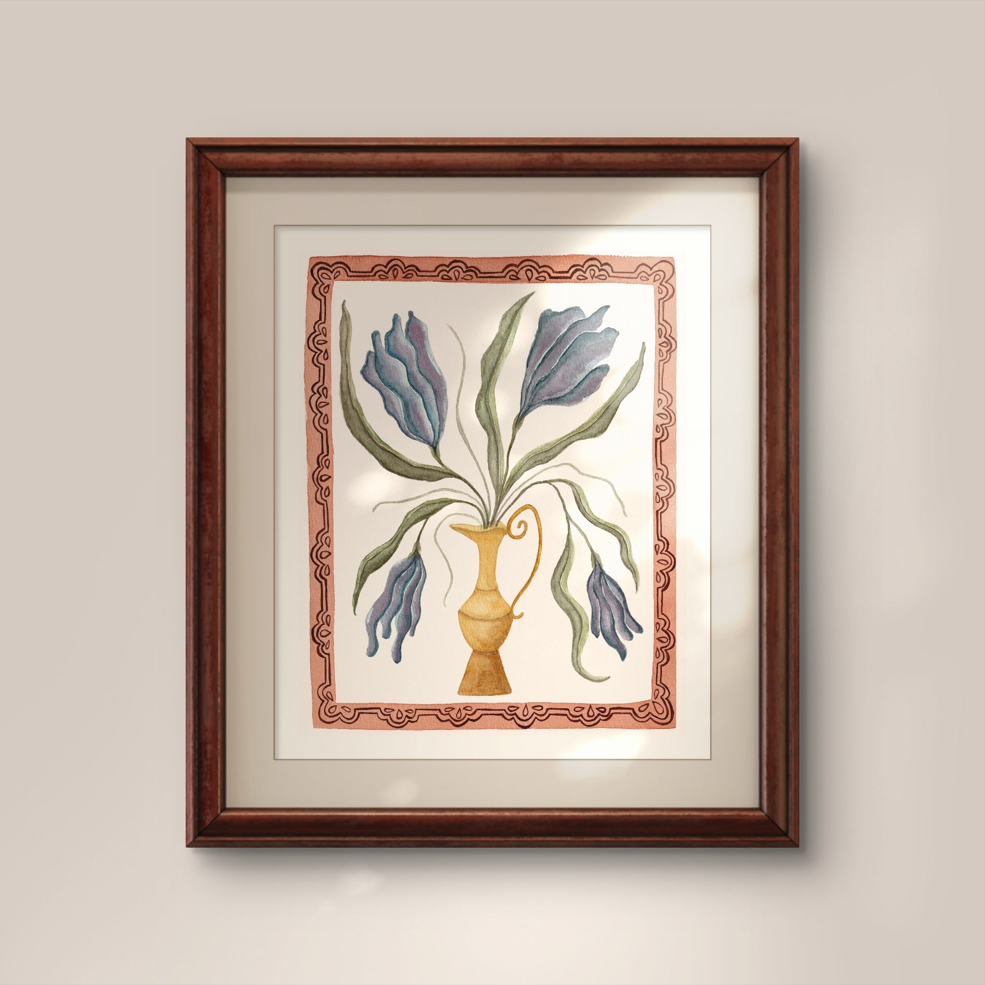 I Guess So is a study of a golden brass vessel juxtaposed with large, blue abstract flowers and a vintage lace-inspired border. It is supposition, exploration, resolution, and a false confidence that surprisingly turns into pride.