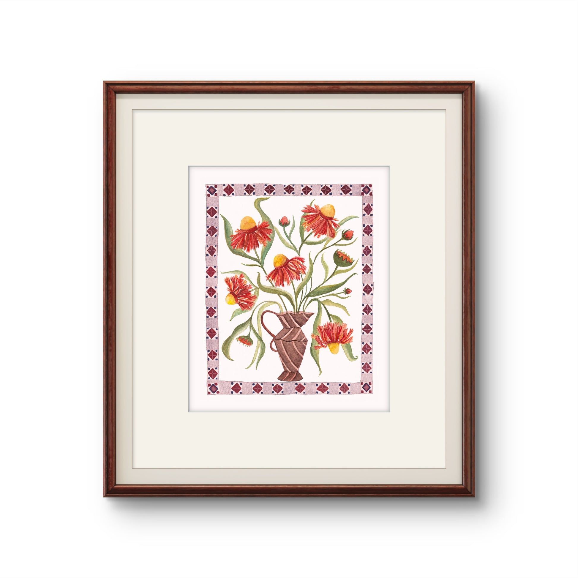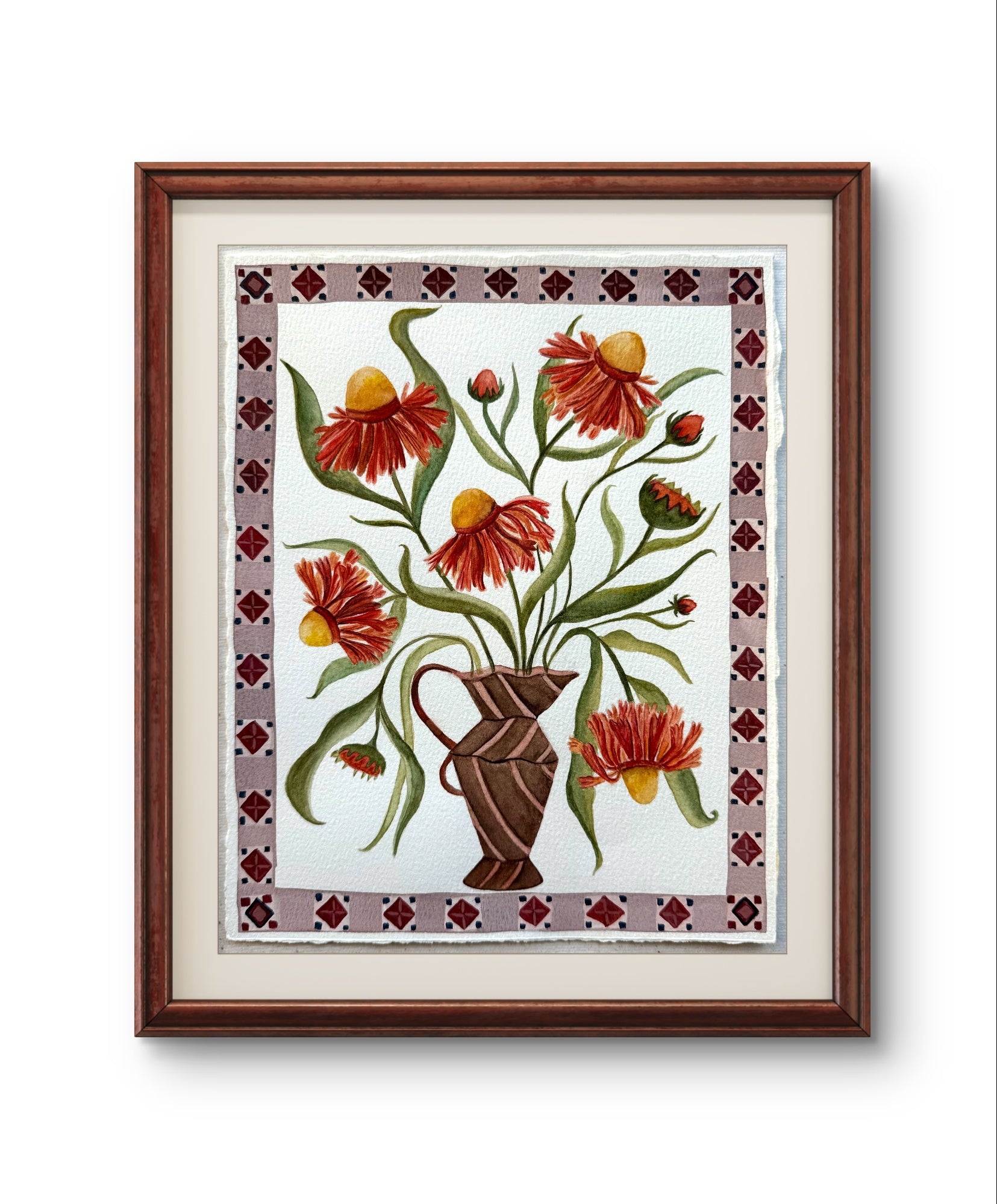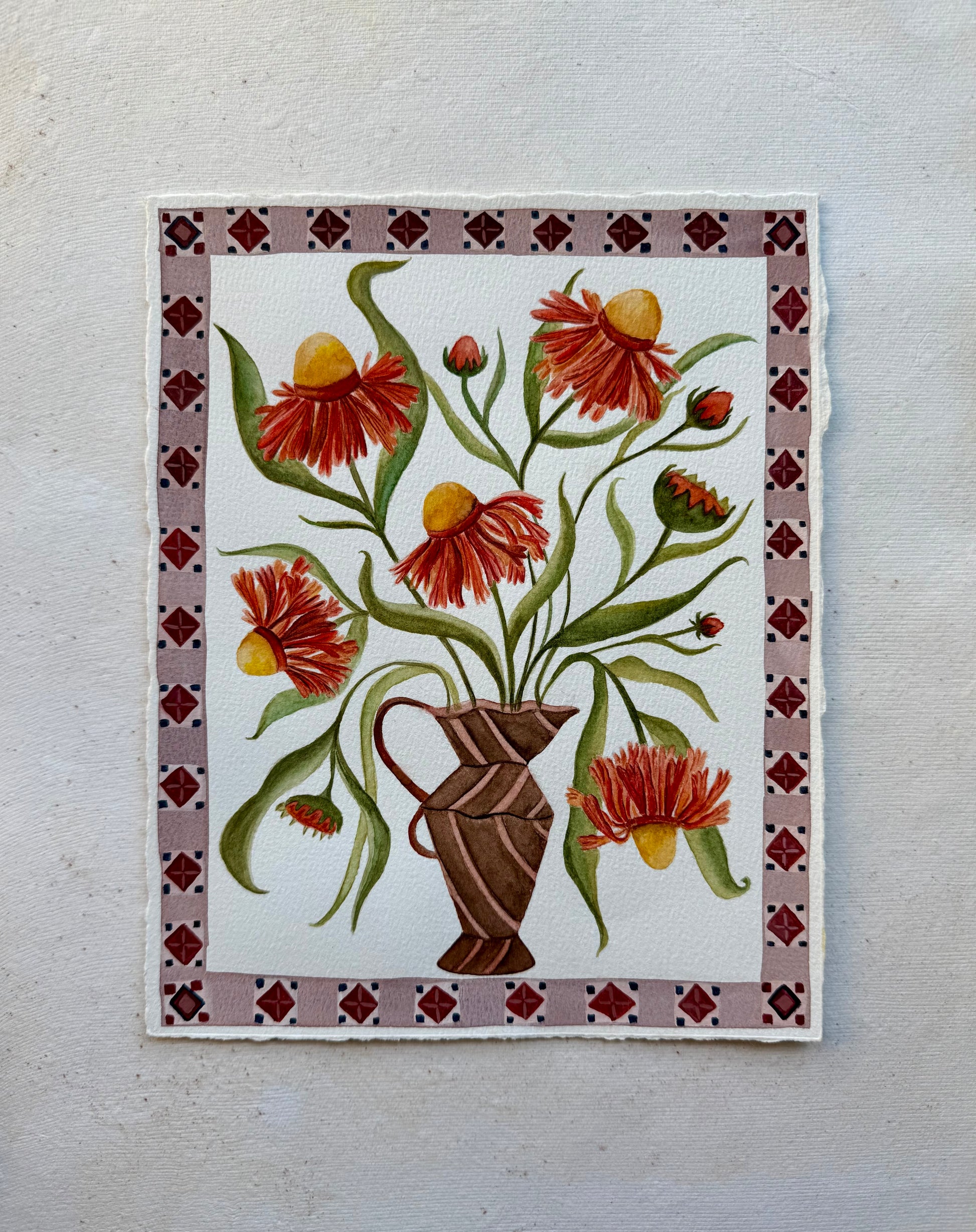 A study of a faceted vintage vessel filled with helenium flowers and framed by a patterned border inspired by traditional tile motifs. I Was Just Wondering is reflection, nervous inquiry, sincerity, and relief.
