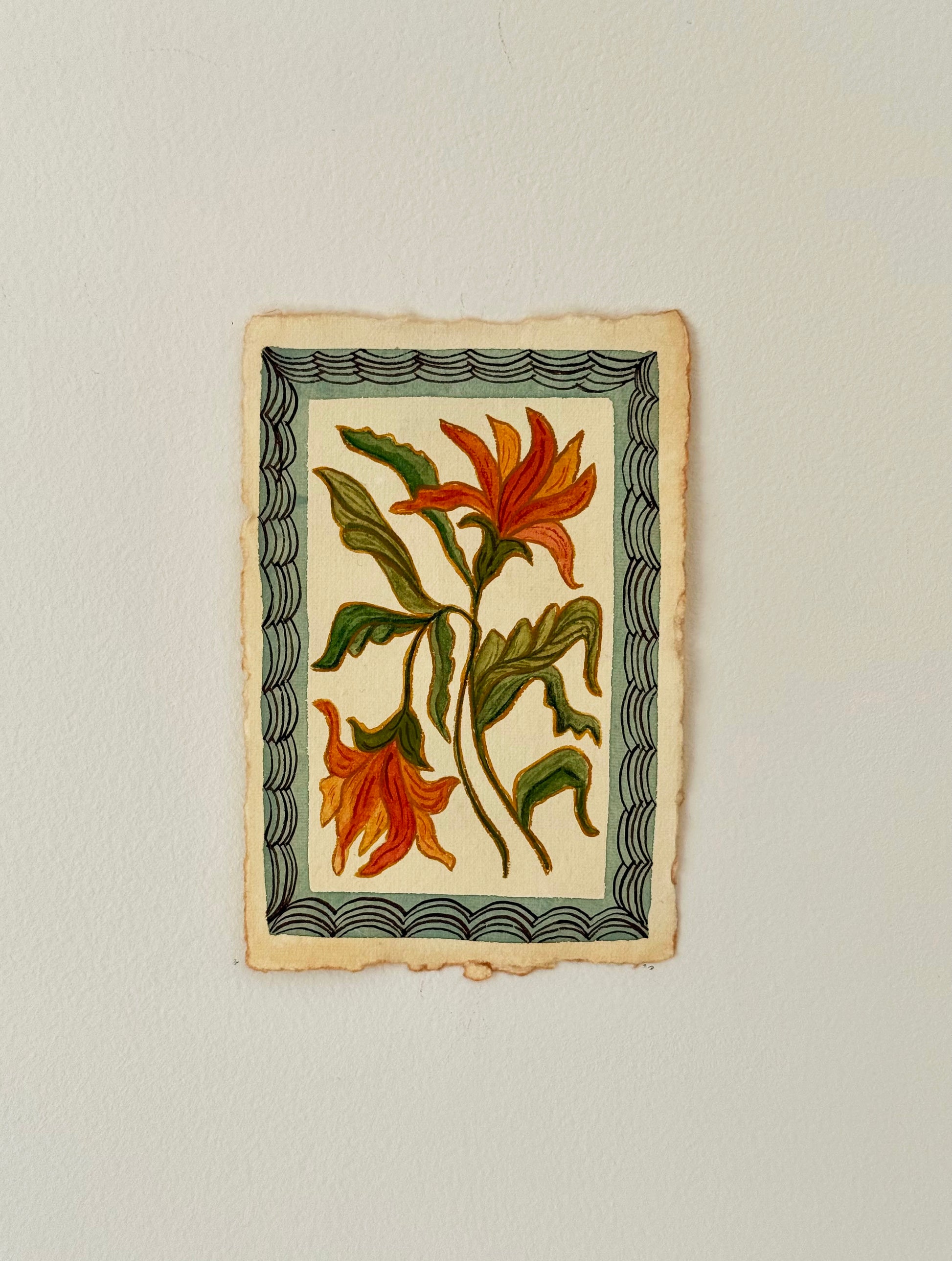 This 4×6" watercolor is painted on cream-colored handmade paper with natural deckled edges. I recommend displaying it in a 5×7" frame or larger to highlight the torn borders, centering the painting with a small piece of tape on the back.