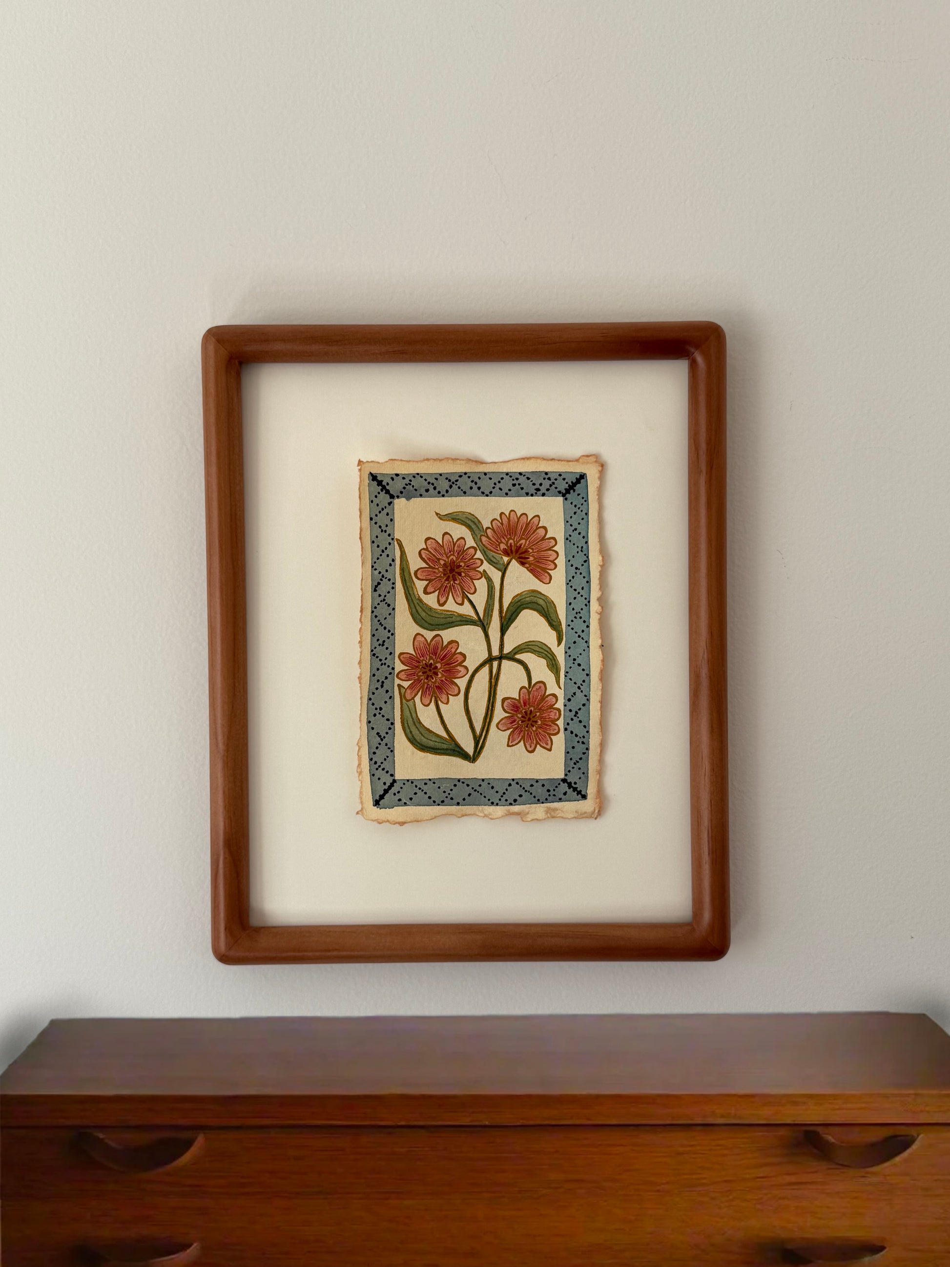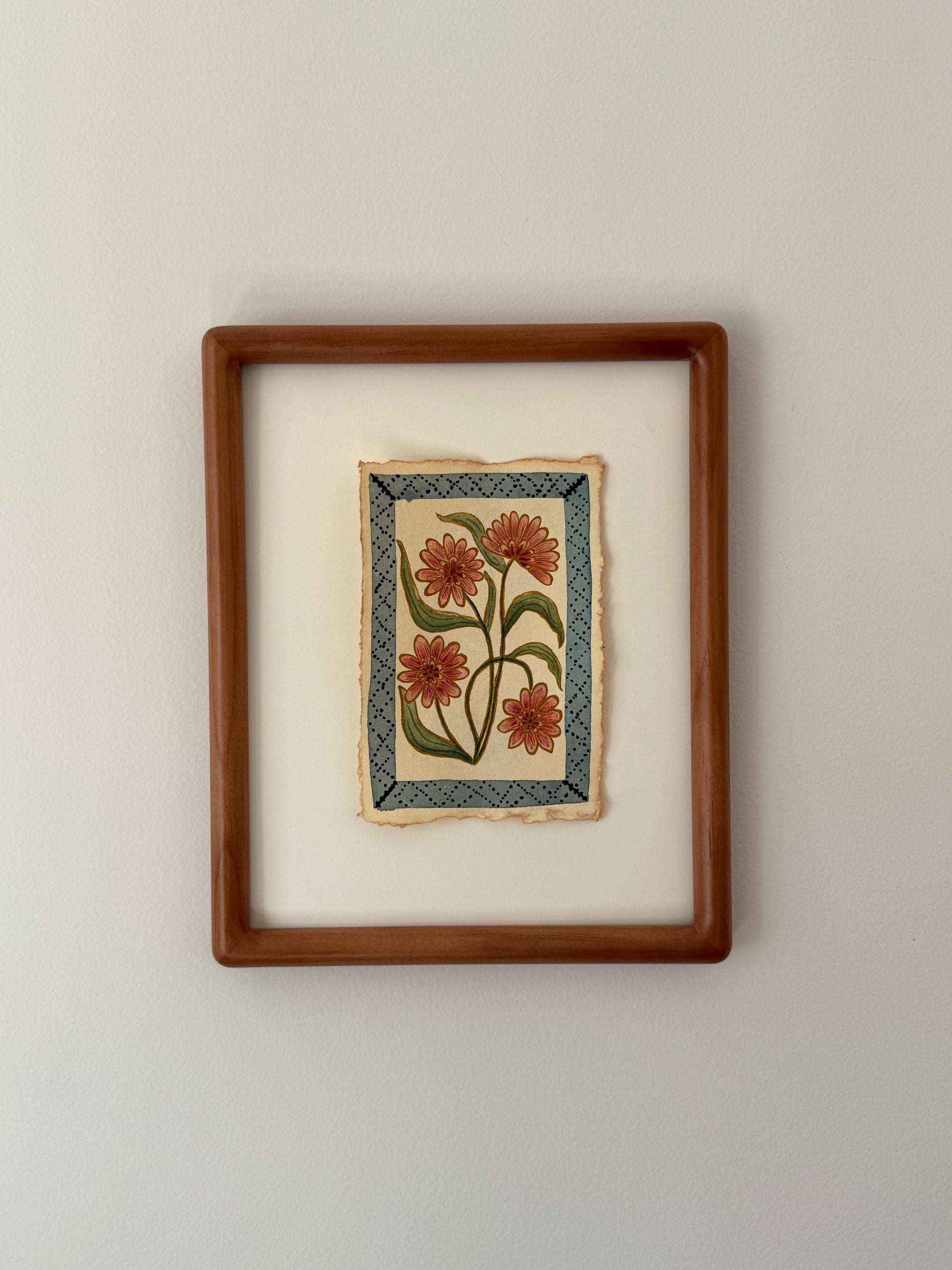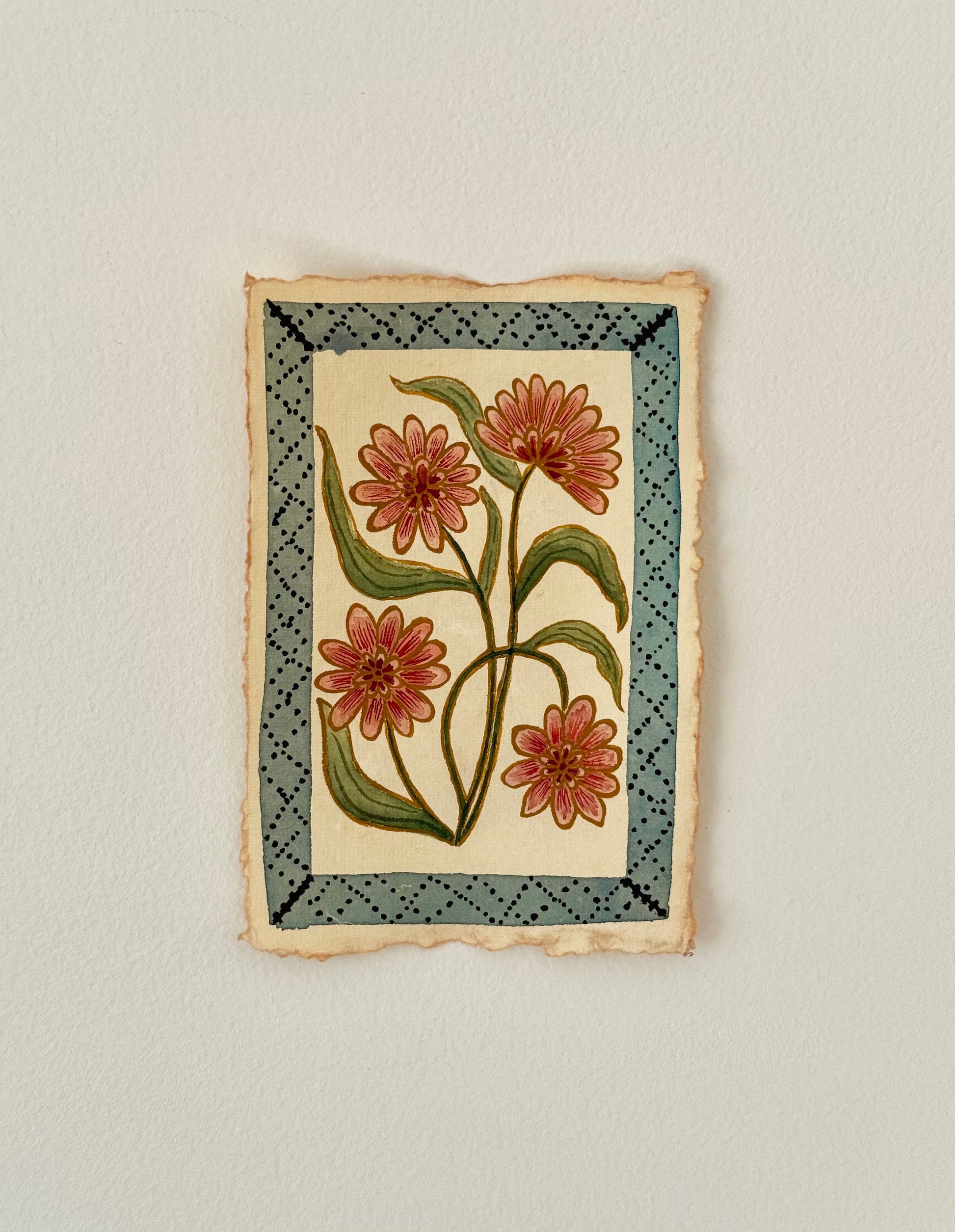 This 4×6" watercolor is painted on cream-colored handmade paper with natural deckled edges. I recommend displaying it in a 5×7" frame or larger to highlight the torn borders, centering the painting with a small piece of tape on the back.